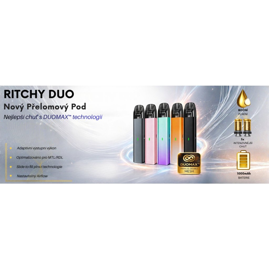 RITCHY DUO POD prináša revolúciu vo svete vapovania s technológiou DUOMAX Parallel Double Mesh, ktorá umožňuje unikátne dvojité žeravenie v kompaktnom pod systéme.