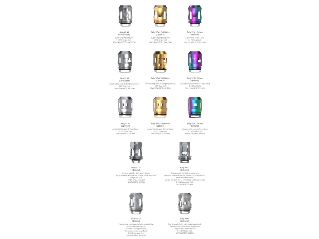 TFV8 BABY V2 A2 - nevídaná 2komôrková technológia kde sa medzi dvomi komôrkami s organickou bavlnou nachádza mesh žeraviace teliesko, sľubuje okrem mohutných oblakov pary aj perfektné podanie chutí pomocov širokej odparovacej plochy s lineárnym odparovaním. Takto vzniká konzistentná chuť pri každom potiahnutí.