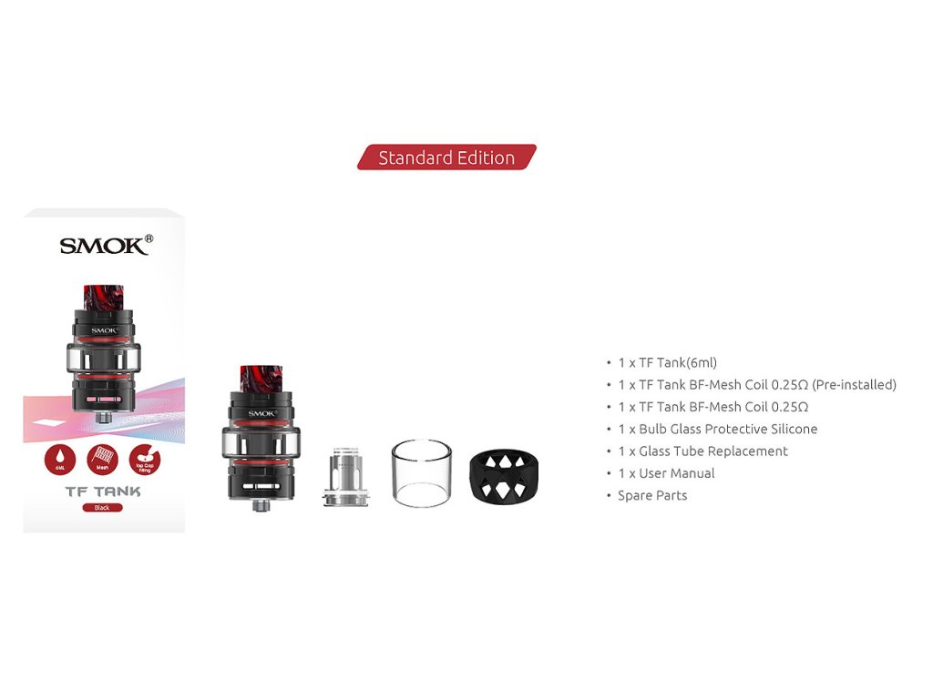 špičkový výkonný subohmový clearomizer je najnovší z rodiny Smoktech a označením TF TANK má objem 6ml a nekopromisné vlastnosti vďaka novým konštrukčným zlepšeniam a novým žeraviacim tekieskam TF TANK.