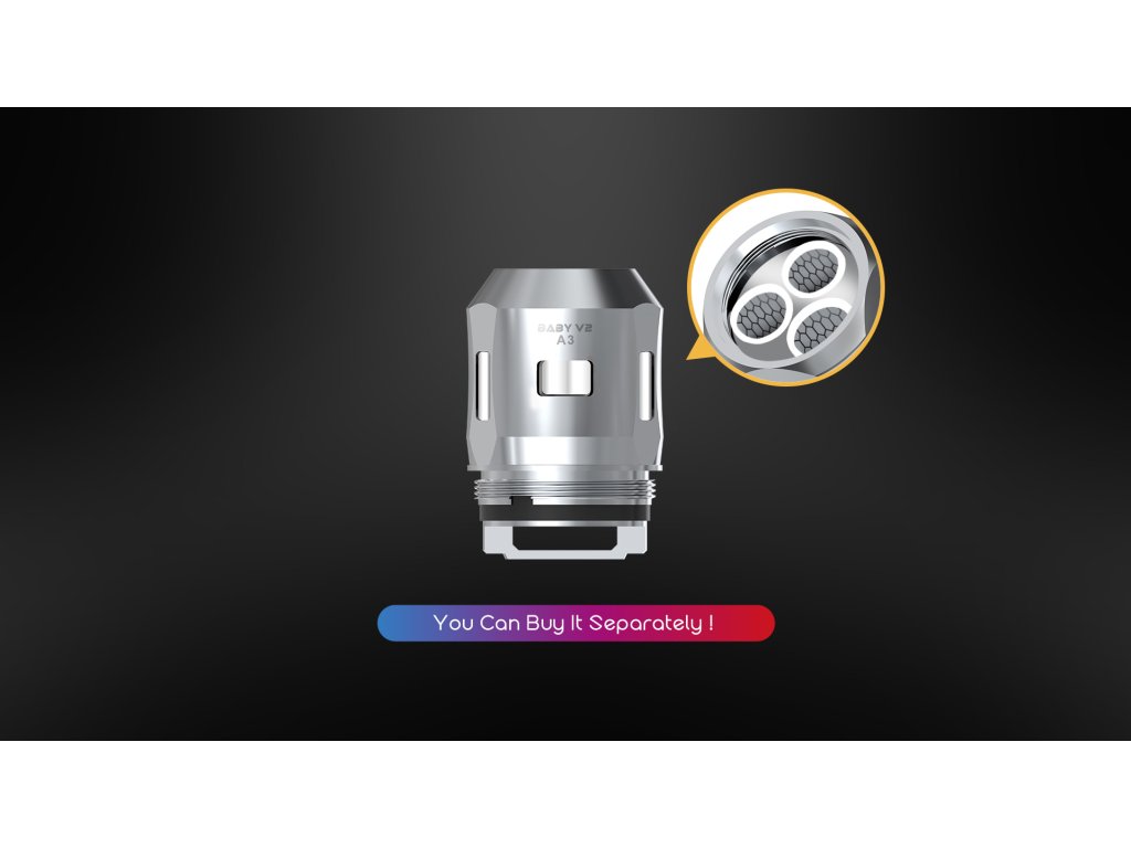 V základnej sade má TFV8 Baby dve silné nové telieska, Baby V2 A1 a A2, A1 má super veľké vykurovacie priestory, ktoré vám ponúkajú rýchly nástup pary. A2 má štruktúru s dvojitým okom a vytvára obrovský parný oblak.