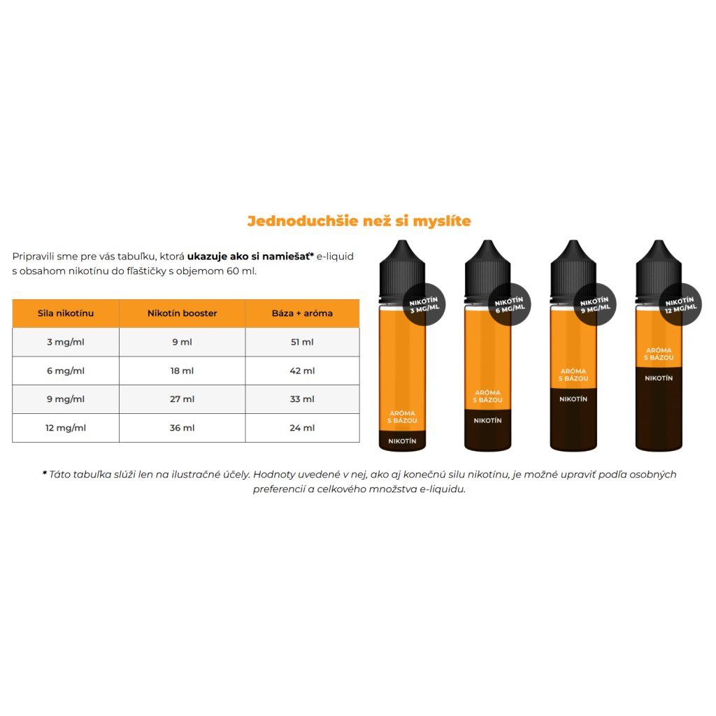 Disponuje konzistenciou 50VG/50PG alebo 70VG/30PG a koncentráciou nikotínu 20 mg/ml.