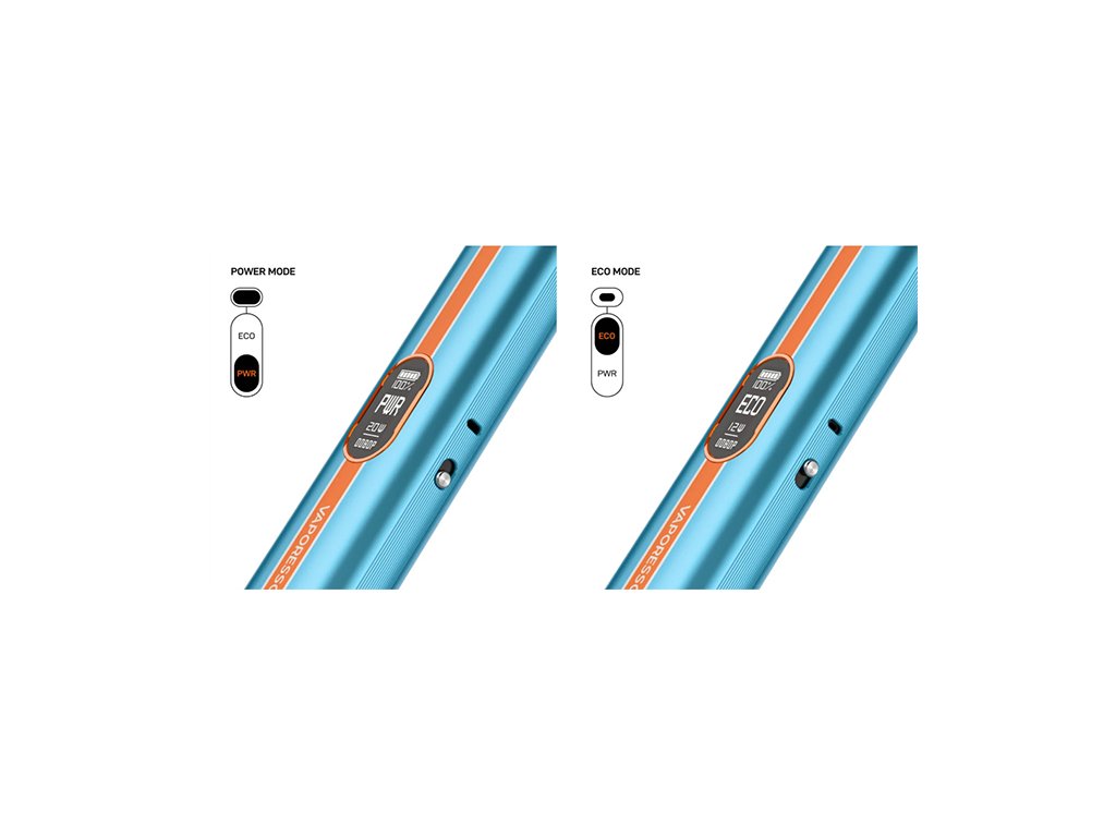 Režimy ECO a PWR sú navrhnuté tak, aby optimalizovali spotrebu energie a výstupný výkon, čím dokonale prispôsobujú výkon zariadenia vašim preferenciám a potrebám. Režim ECO je určený na maximalizáciu výdrže batérie, zatiaľ čo režim PWR poskytuje intenzívny výkon pre silnejšie a rýchlejšie produkovanie pary.