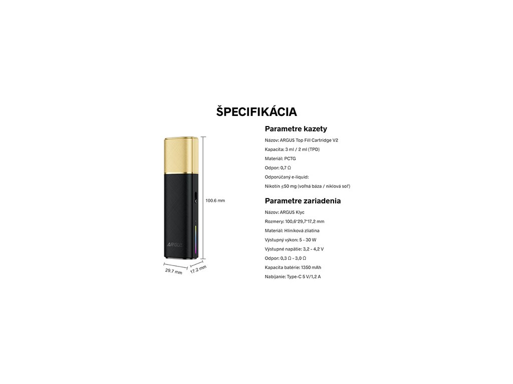 - 1× Náplň ARGUS Top Fill V2 0,7 Ω (3 ml, predinštalovaná)