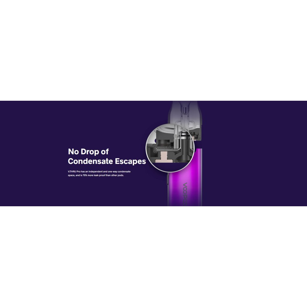 VooPoo sa pýši že pri Pod systémoch používa špecialnu jednosmernú komoru pre kondenzát a takto je dosiahnuté zabránenie pretekania.